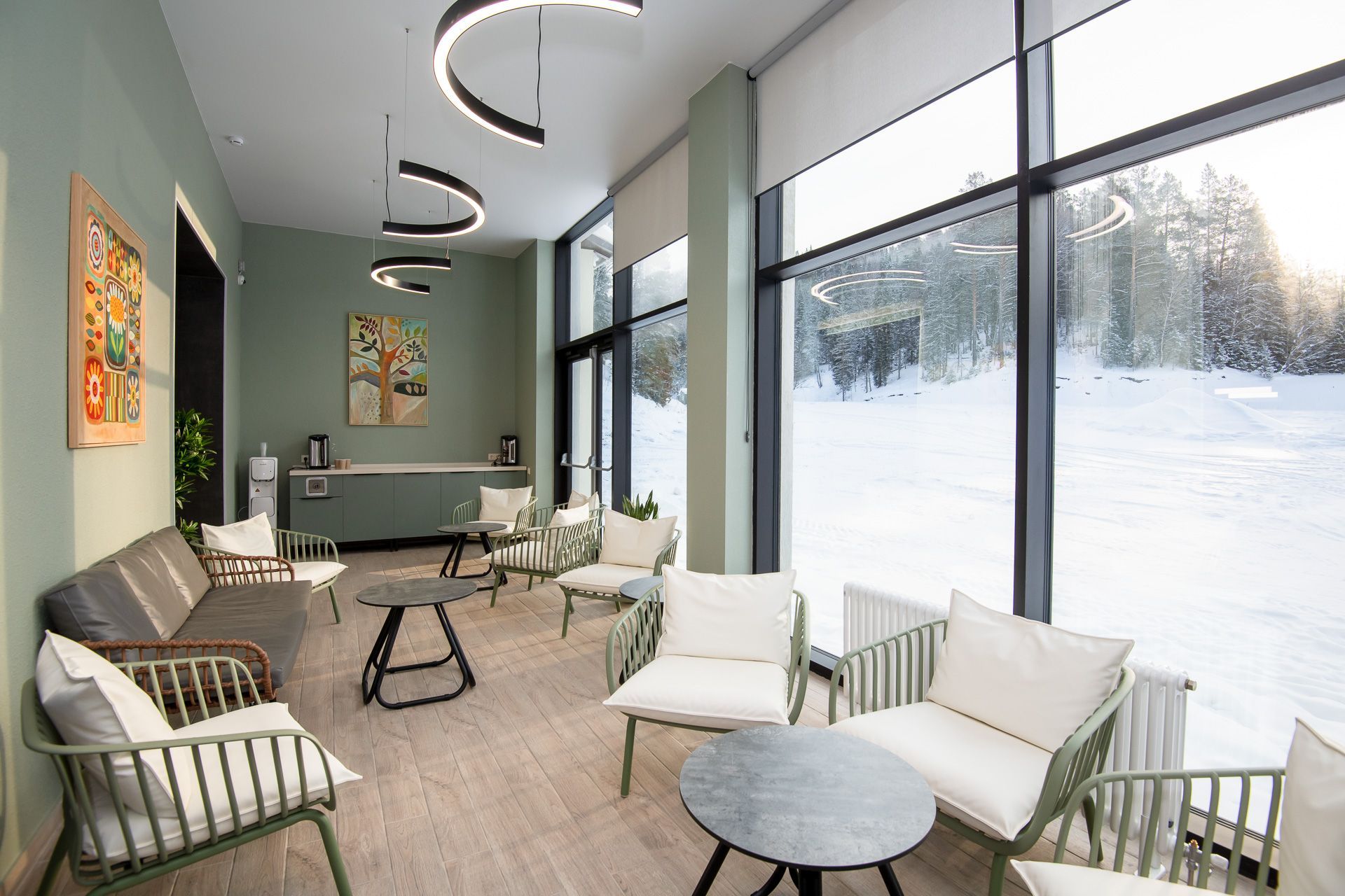 Основной зал ресторана рассчитан на 60 мест. Банкетный зал с видом на озеро с круговым панорамным обзором на природу Алтая готов принять до 100 гостей.